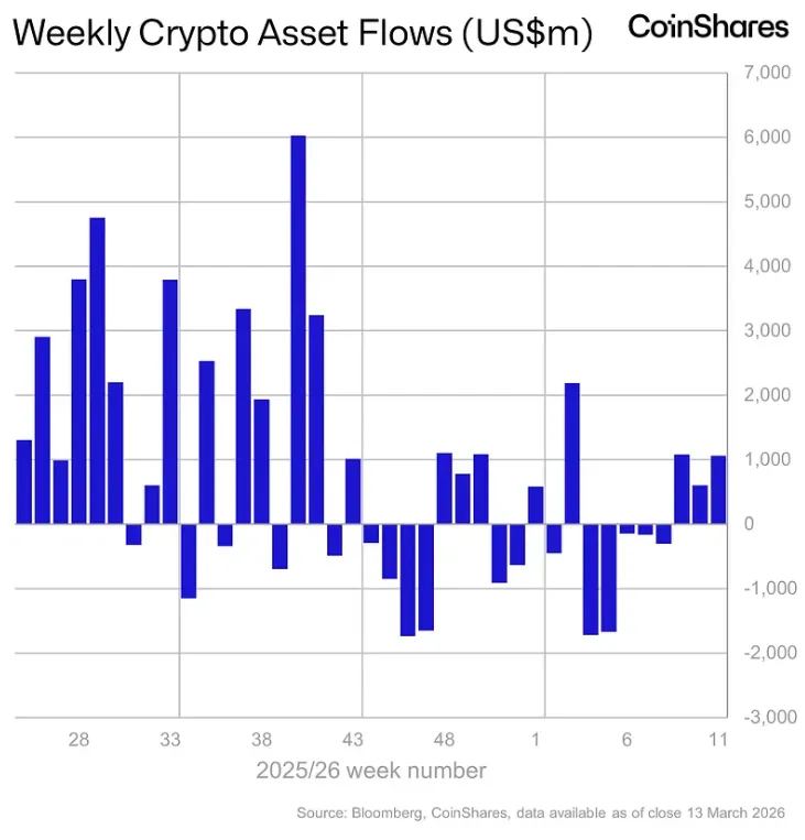 С 9 по 13 марта приток средств в криптовалютные инвестиционные продукты составил $1,06 млрд. Позитивная динамика продолжается третью неделю подряд, сообщили аналитики CoinShares.