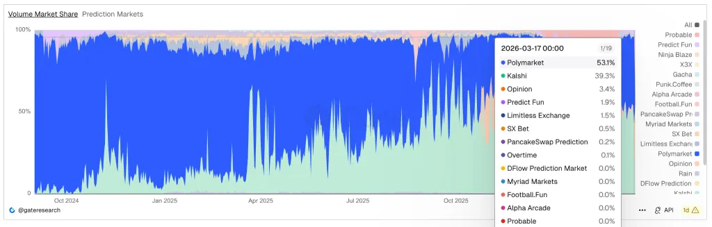 Polymarket и Kalshi — два лидера растущего сегмента предсказаний. По состоянию на март первая занимает 53,1% рынка, вторая — 39,3%.