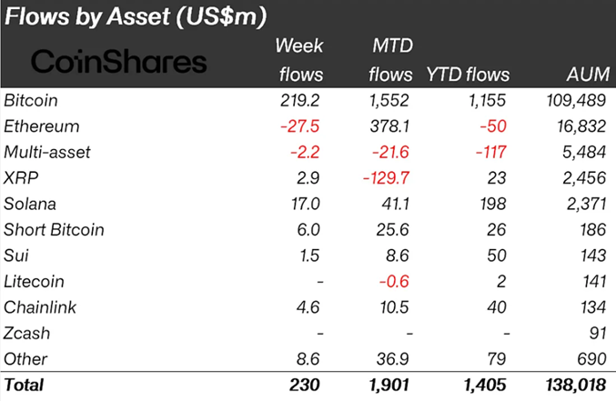 Клиенты по-прежнему фокусируются на фондах на основе биткоина (BTC), приток в которые составил $219,2 млн против $793,4 млн неделей ранее.