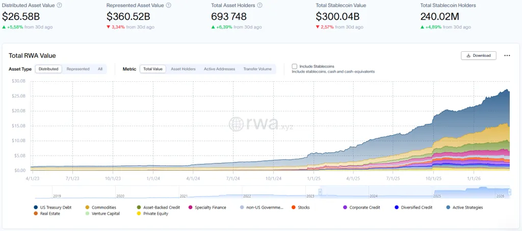Согласно данным RWA.xyz, с 2025 года рыночная стоимость цифровых активов реального мира выросла примерно на 360% — до $26,5 млрд.