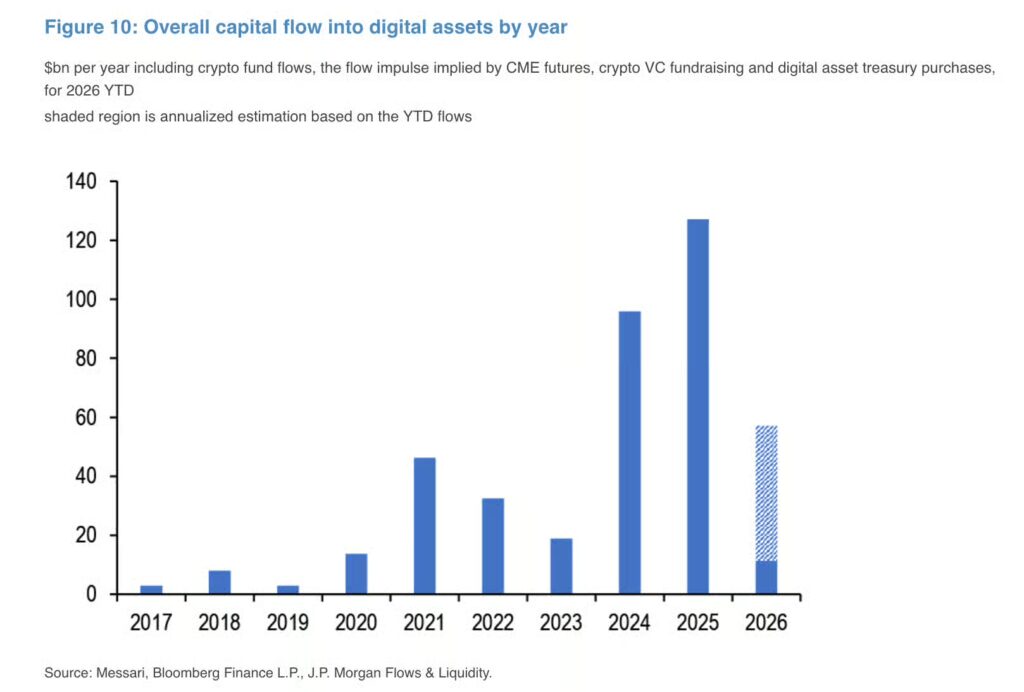 Аналитики JPMorgan заявили о резком снижении притока средств в криптоактивы в I квартале 2026 года, пишет The Block. По их оценке, общий объем составил около $11 млрд, что примерно в три раза меньше аналогичного показателя прошлого года.