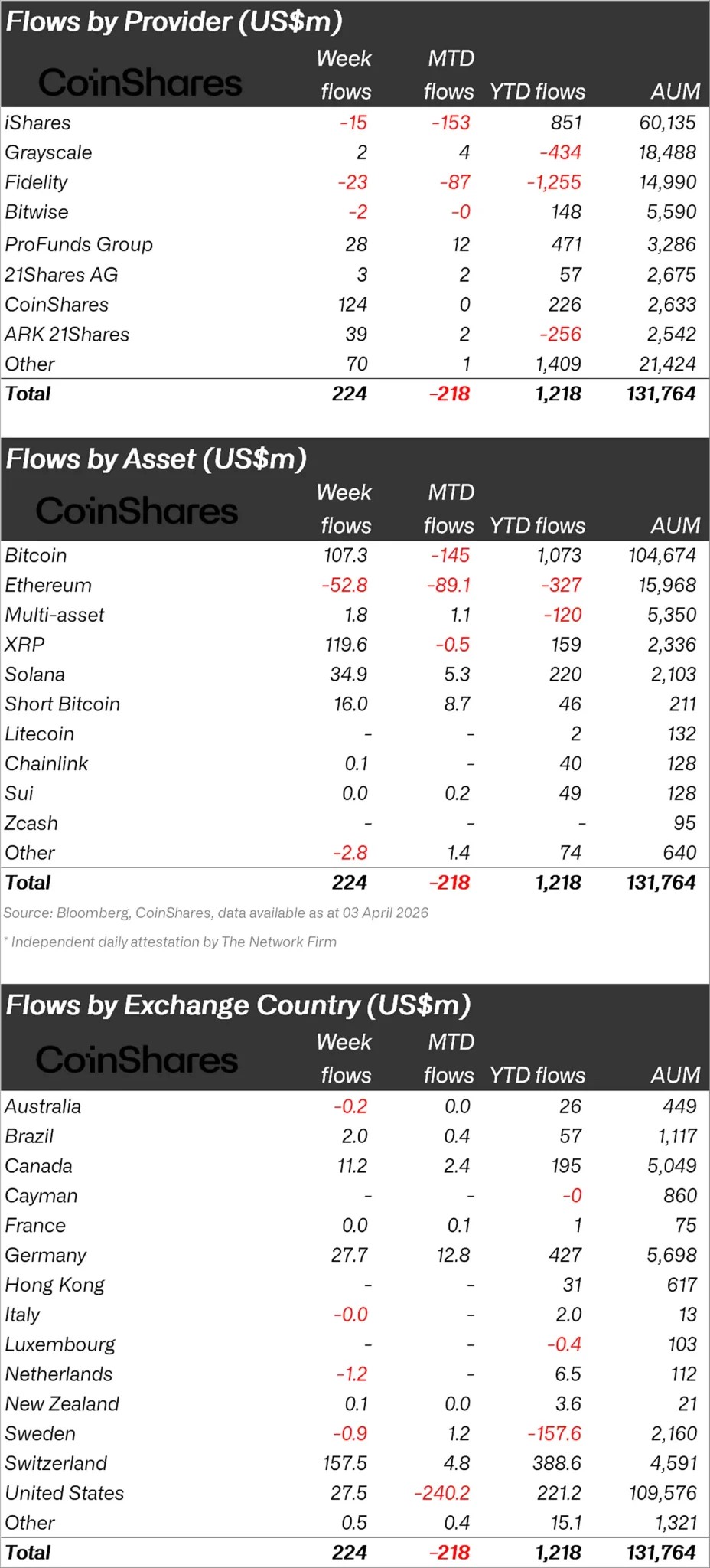 «В инвестиционные продукты в сфере криптовалют поступило 224 миллиона долларов, но к концу недели тенденция изменилась из-за более сильных макроэкономических данных и жестких ожиданий».