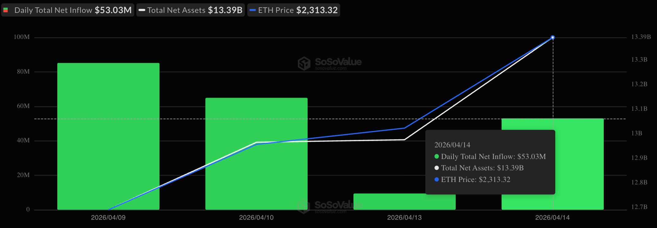 ETF на эфир продемонстрировали такую же динамику, обеспечив чистый приток средств в размере 53,03 млн долларов в четвертый день подряд. Как и в случае с биткойном, рост был повсеместным и не сопровождался оттоком средств.