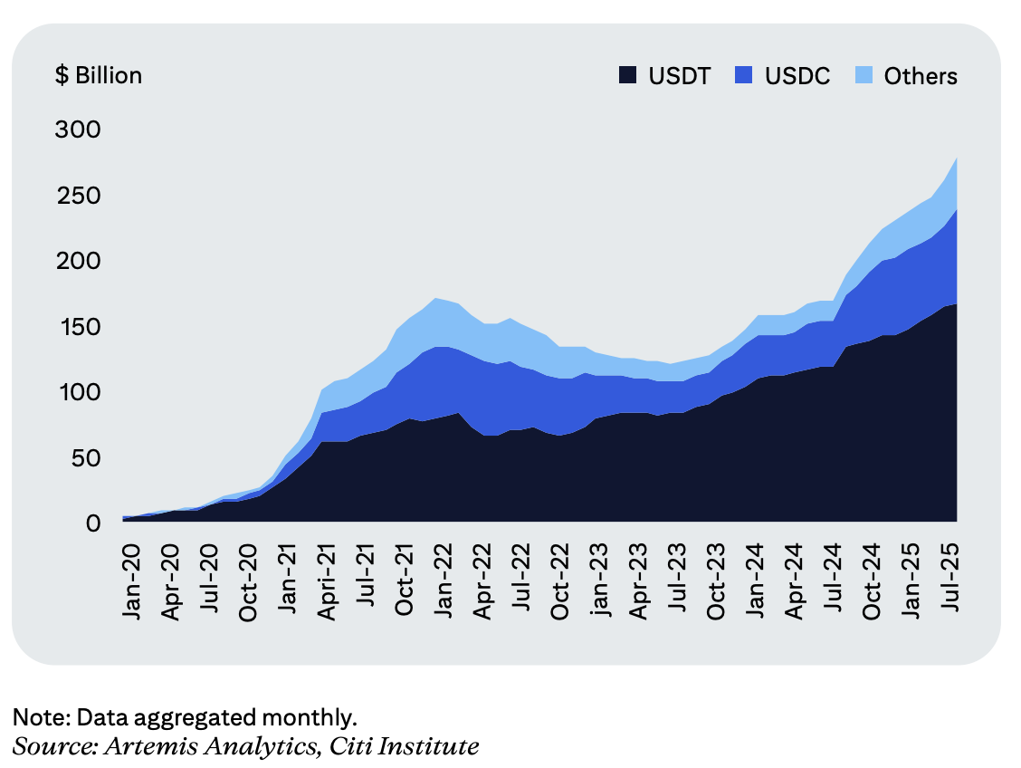 Динамику предложения стейблкоинов отражает и $GPS_Report_Stablecoins_2030.pdf" rel="noopener" target="_blank">отчёт Citi $GPS «Стейблкоины-2030»: по данным Artemis Analytics и Citi Institute, предложение $USDT к середине 2025 года превысило $185 млрд, тогда как объём $USDC составил около $80 млрд. Остальные стейблкоины держатся на уровне около $45 млрд. Все три сегмента демонстрируют устойчивый восходящий тренд с 2020 года.