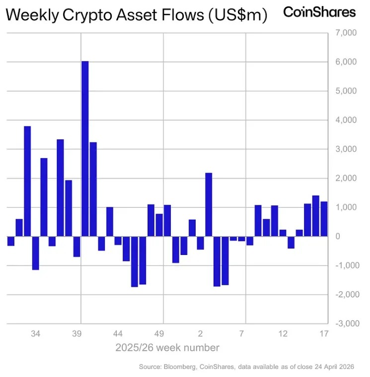 С 20 по 24 апреля поступления в инвестиционные продукты на базе цифровых активов составили $1,2 млрд. Положительная динамика сохраняется четвертую неделю подряд, согласно отчету CoinShares.