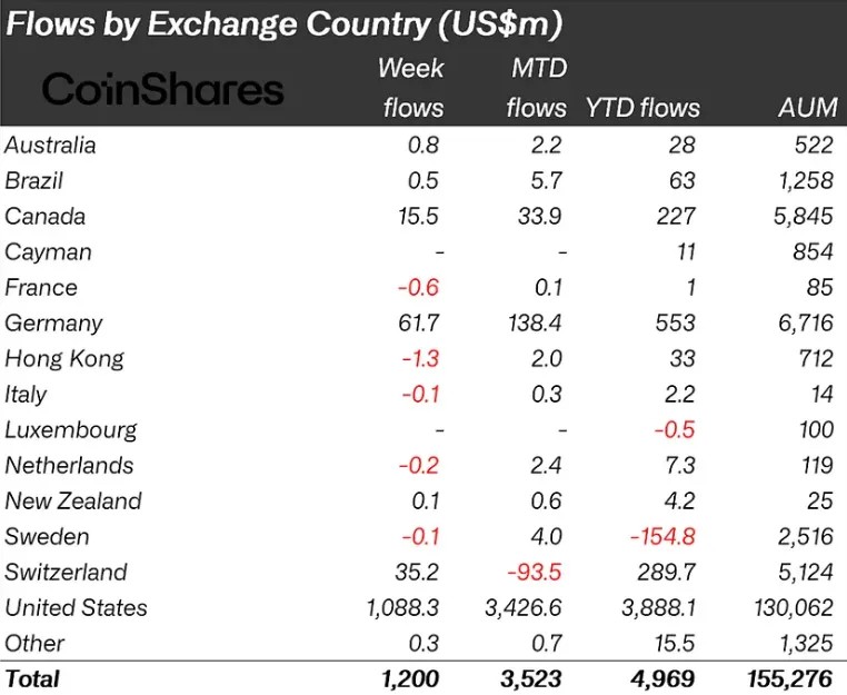 США сохранили лидерство по объему вложений с результатом $1,1 млрд. В Германии приток средств вырос вдвое и составил $61,7 млн. Инвестфонды Швейцарии и Канады также зафиксировали приток капитала — $35,2 млн и $15 млн соответственно.