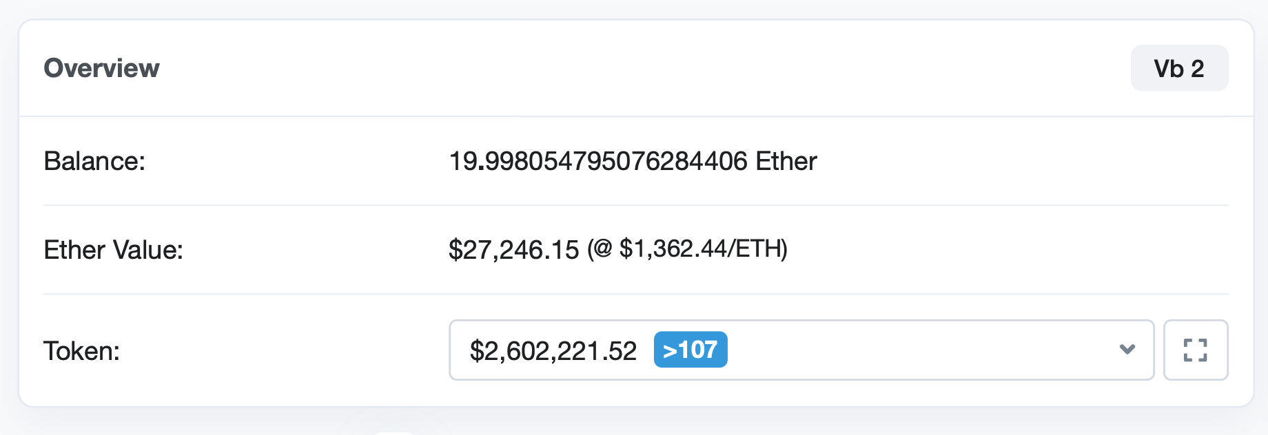 На втором адресе содержится чуть меньше 20 эфиров, зато токенов здесь есть на 2.6 миллиона долларов.