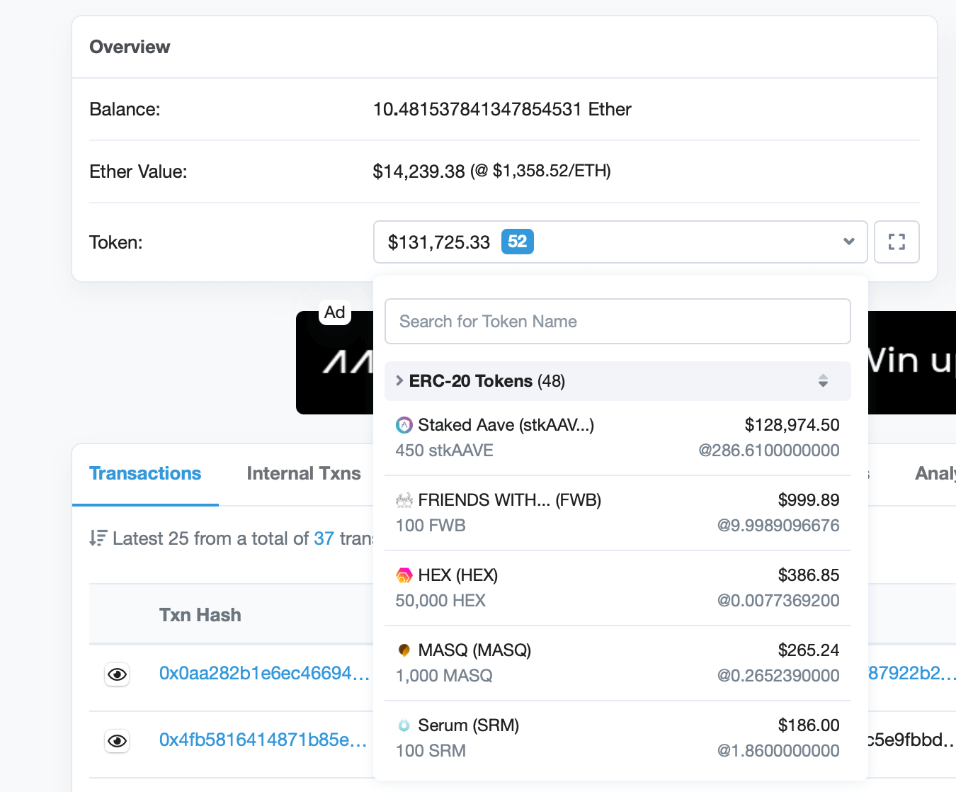 Здесь есть эфиры на 14 тысяч долларов и гора токенов на как минимум 130 тысяч долларов. Большую долю среди них занимает Staked Aave, то есть монеты так называемой платформы ликвидности AAVE, отправленные в стейкинг. Они помогают работе системы и обеспечивают пассивный доход владельцу.