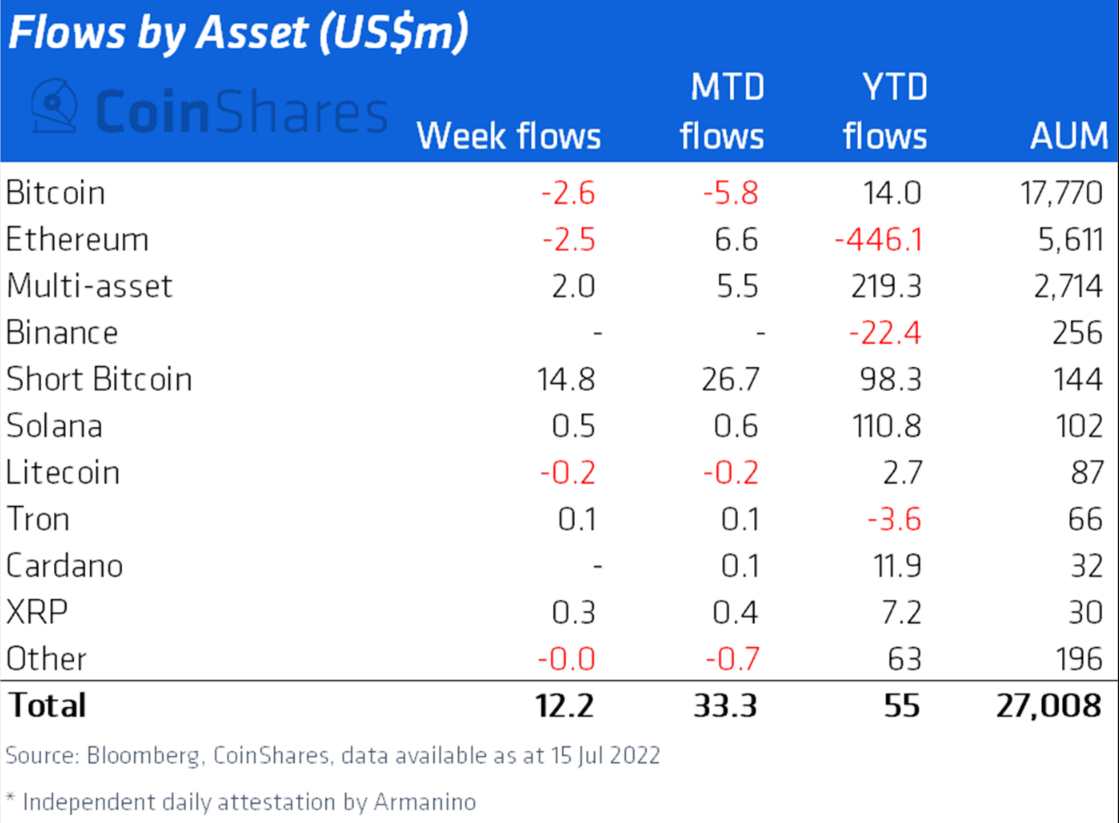 Инвестиционные продукты на основе цифровых активов на прошлой неделе получили приток в размере $ 15 млн, $ 12 млн из них направились в шорты (обратная цена), чистый отток по лонгам инвестиционных продуктов составил $2,6 млн.