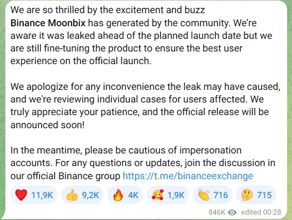 В группе с анонсами новостей Moonbix 18 сентября команда Binance опубликовала пост, в котором они выражают сожаления об утечке данных. По словам разработчиков, они рады, что тапалка вызвала такой ажиотаж. При этом они предупреждают о том, что продукт еще не готов к запуску. Также представители Binance просят пользователей набраться терпения и обещают поделиться датой релиза в ближайшее время.