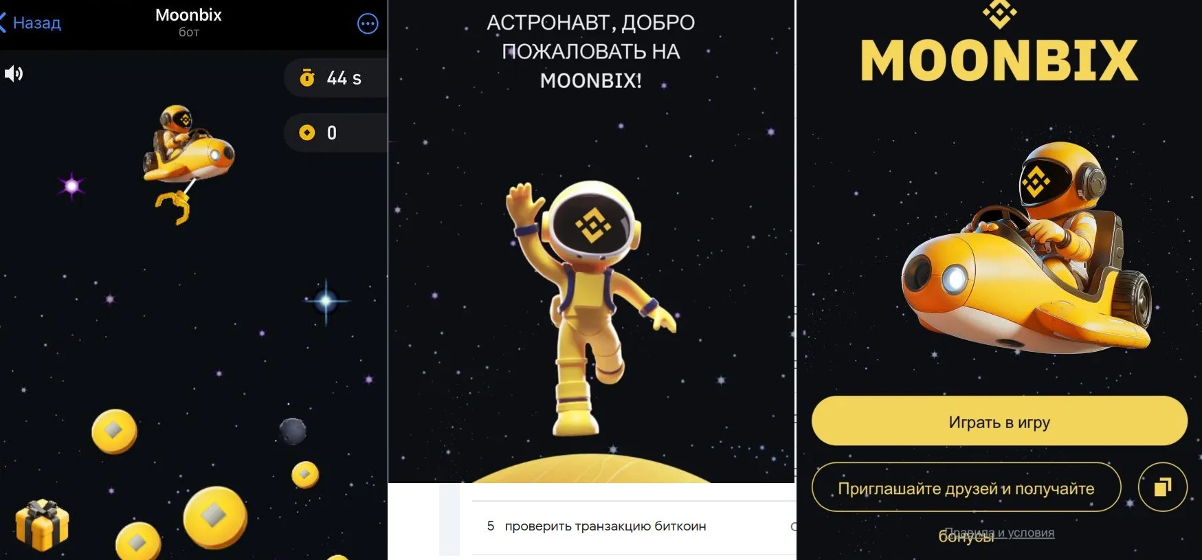 Moonbix — это игра-тапалка (кликер) в мессенджере Телеграм. Проект построен вокруг темы космоса. Игрокам предложено исследовать галактики и собирать ценные предметы.