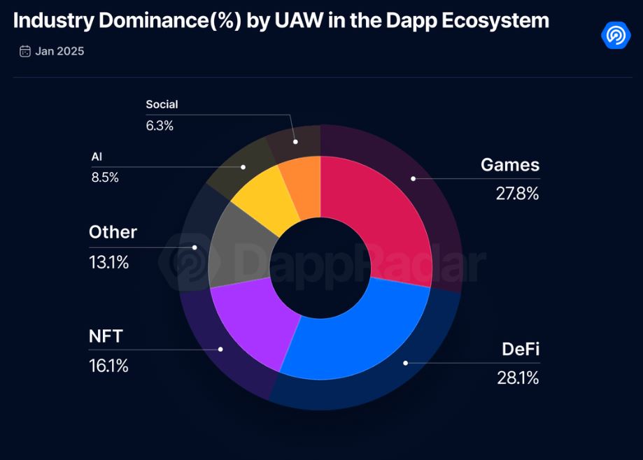 Во всей экосистеме DApp ежедневно было 26,7 млн UAW, при этом DeFi продолжает немного опережать игры с разницей в 1%.