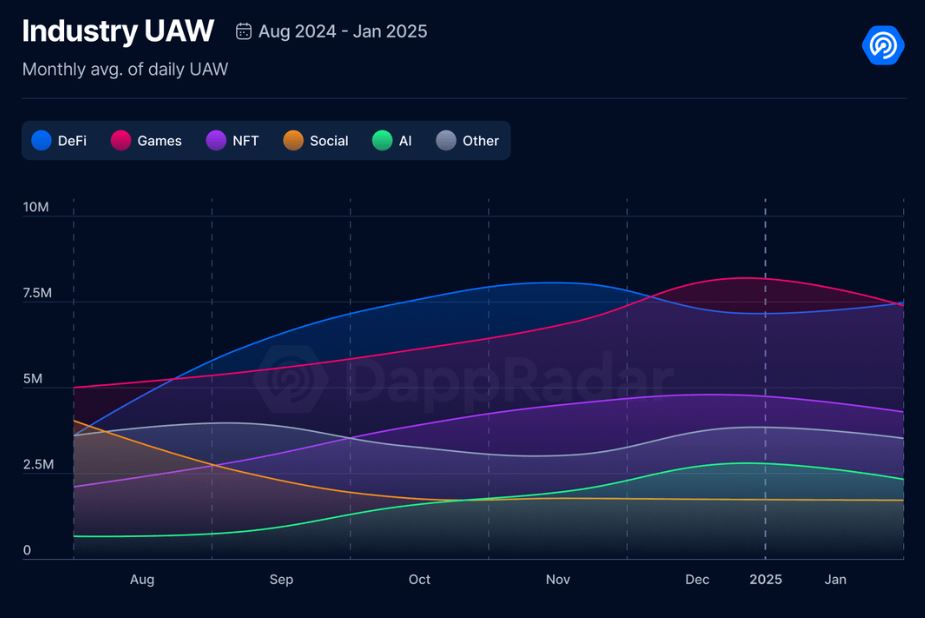 Игры Web3 в прошлом месяце насчитывали более 7 миллионов уникальных активных кошельков (UAW) в день — на 386% больше, чем в январе 2024 года, согласно игровому отчету DappRadar от 13 февраля.