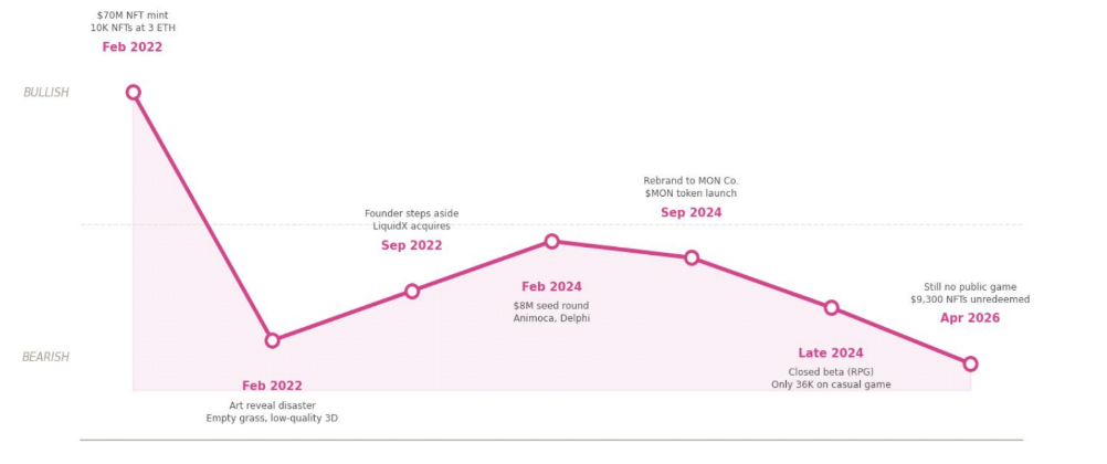 Всего было реализовано около 10 000 токенов посредством голландского аукциона с начальной ставкой в 3 ETH. В феврале 2024 года команда получила еще $8 млн в ходе посевного раунда. После этого были ребрендинг, выпуск токена и бета-версии. Окончательный билд так и не представили.