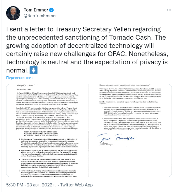 Конгрессмен США Том Эммер направил письмо министру финансов Джанет Йеллен по поводу санкций в отношении миксера криптовалюты Tornado Cash, введённых 8 августа. В нём он задал ряд вопросов, чтобы прояснить позицию Управления по контролю за иностранными активами Министерства финансов.