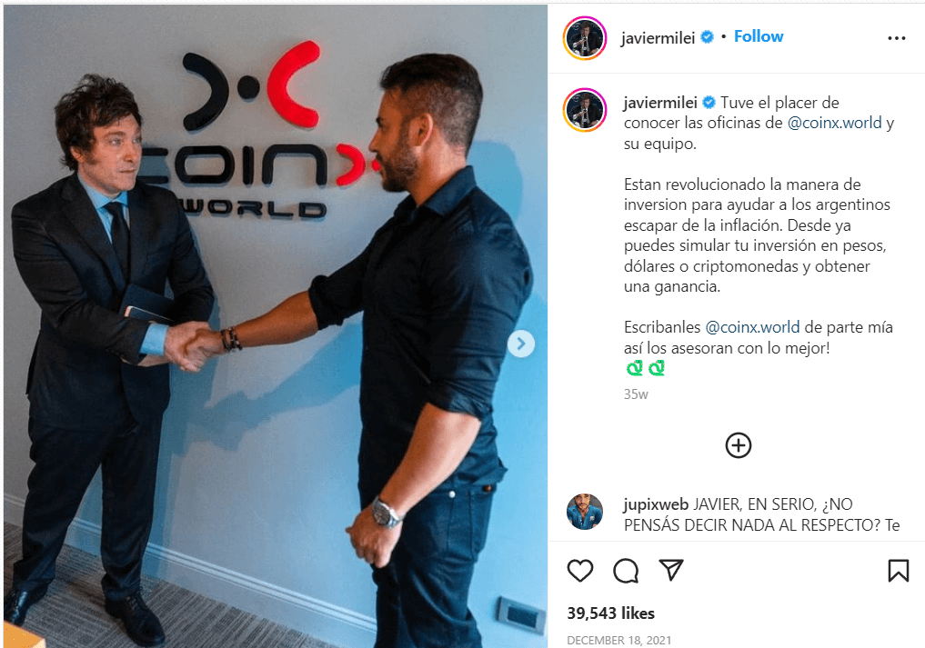 Представители CoinX заявляли, что площадка может автоматизировать процесс трейдинга с помощью команды опытных трейдеров и искусственного интеллекта. В декабре Милей посетил офис стартапа в Буэнос-Айресе. На фото в Instagram он позирует с членами команды CoinX.