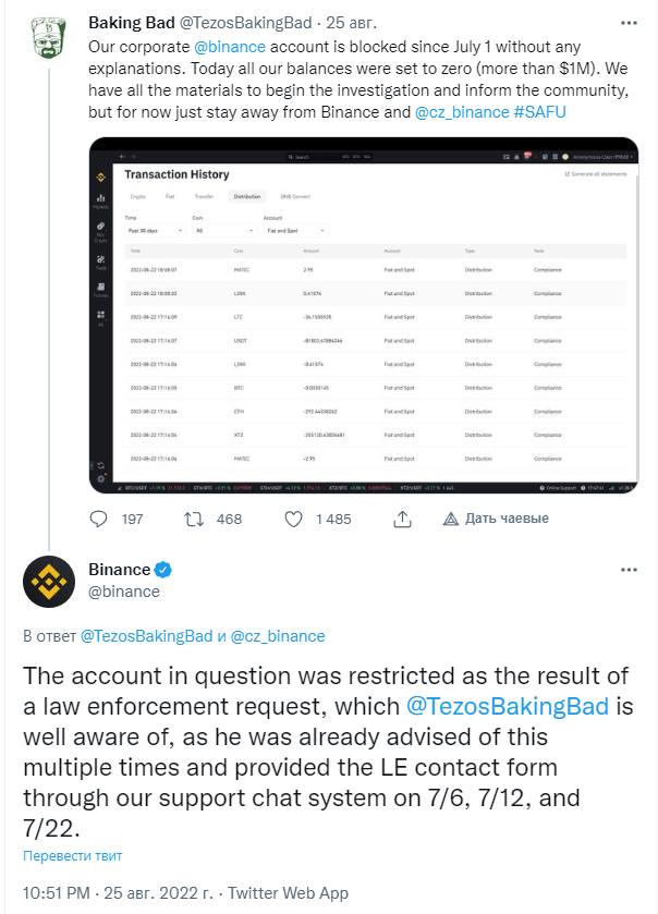 BakingBad хорошо осведомлён о действиях Binance, и ему уже несколько раз сообщали об этом, и он предоставил контактную форму LE через нашу систему чата поддержки 6/7, 12/7 и 22/7, – возразили в Binance. — Попытка ввести сообщество в заблуждение относительно вашего дела, к сожалению, ничего не изменит.