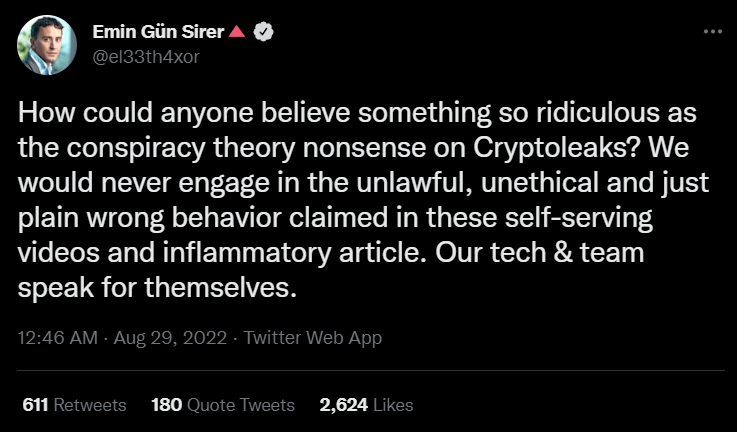 Основатель Ava Labs Эмин Гюн Сирер возмутился обвинениями, назвав их «чепухой теории заговора». Он добавил:
