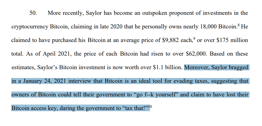 Более того, 24 января 2021 года во время интервью Сейлор хвастался, что Биткоин является идеальным инструментом для уклонения от уплаты налогов. Он заявлял, что владельцы BTC могут сказать своему правительству “отвалить” и заявить о потере ключей доступа к биткоинам, заодно посоветовав властям обложить налогом это.