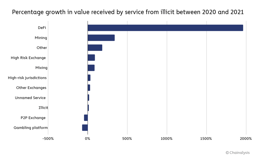 Прирост объема украденных средств по разным сферам крипторынка в период с 2020 по 2021 год
