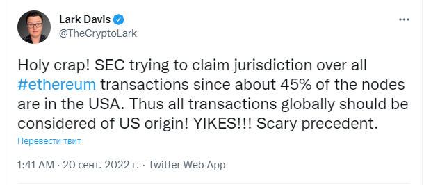 SEC пытается заявить о своей юрисдикции над всеми транзакциями Ethereum, поскольку около 45% нод находятся в США. Таким образом, все транзакции в мире рассматриваются как американские! Это страшный прецедент.