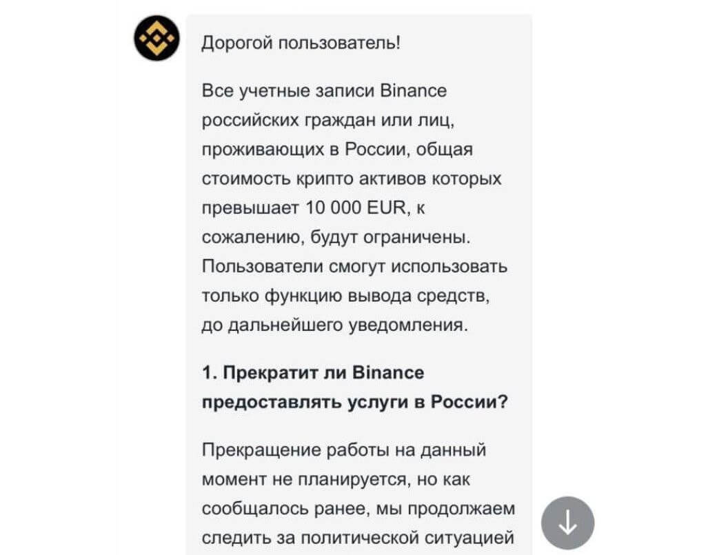 Из-за этого криптовалютная биржа Binance ограничила действие учётных записей пользователей из РФ, на счету которых были монеты в эквиваленте более 10 тысяч евро. Они больше не смогли проводить сделки, а были в состоянии лишь вывести средства с аккаунта.