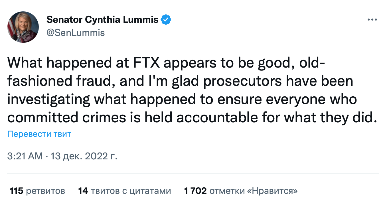 Арест Банкмана-Фрида и обвинения против него – ожидаемые новости для многих в криптосообществе и за пределами него. Вот как произошедшее прокомментировала республиканский сенатор Синтия Ламмис, которая в прошлом часто выступала с поддержкой криптоиндустрии.