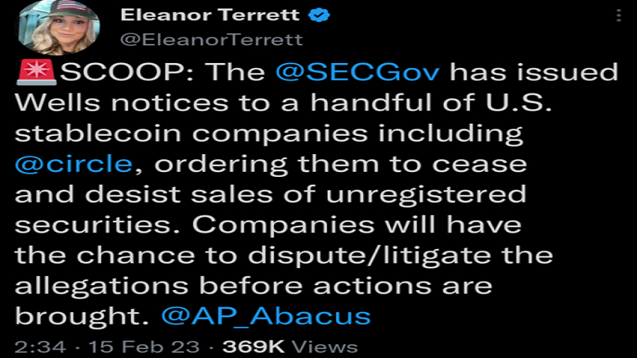 Рано утром 15 февраля журналистка Fox Business Элеанор Терретт ( Eleanor Terrett) сообщила в Твиттере о расширении репрессий со стороны Комиссии по ценным бумагам и биржам США (SEC) в отношении эмитентов стейблкоинов. По ее словам, компаниям было приказано прекратить продажу «незарегистрированных ценных бумаг».