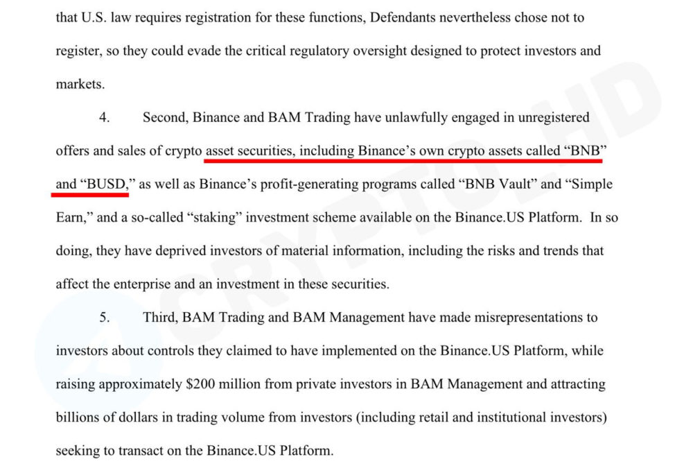 SEC подает в суд на биржу Binance и Чанпэн Чжао за нарушение законов США по ценным бумагам. Binance и генеральный директор биржи Чанпэн Чжао, обвиняются в нарушении правил США по ценным бумагам согласно заявлению федерального суда. Цена BNB уже упала на 5 % на фоне появления сообщения о иске в суд со стороны SEC. SEC назвал BNB и BUSD ценными бумагами.