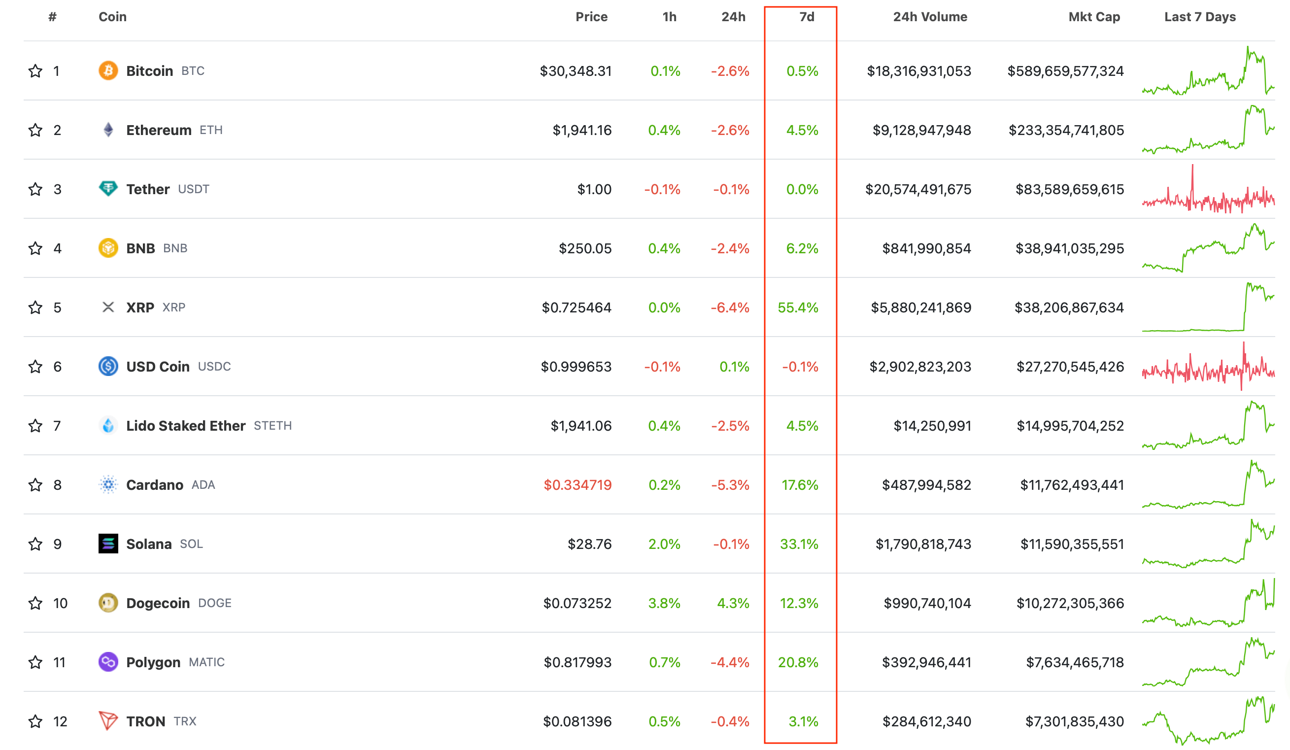 Уже к сегодняшнему дню инвесторы и трейдеры немного отошли от эйфории, ну а рынок пережил небольшую коррекцию. Впрочем, рост XRP в масштабах недели по-прежнему составляет 55 процентов, тогда как второе место среди крупнейших монет по капитализации заняла Solana с результатом 33 процента.