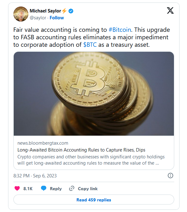 Что произошло? Глава совета директоров MicroStrategy Майкл Сэйлор положительно оценил изменения в правилах бухгалтерского учета криптоактивов для компаний, принятые американским Советом по стандартам финансового учета (FASB). По его словам, инициатива устраняет основное препятствие для корпоративного принятия биткоина в качестве собственного актива.