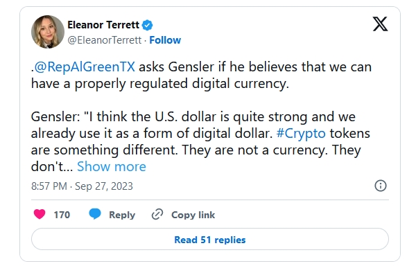 В ходе заседания председатель комитета, республиканец Патрик Макгенри, раскритиковал Генслера за «крестовый поход против криптоиндустрии», о котором ранее заявлял и глава криптобиржи Coinbase Брайан Армстронг. Макгенри утверждал, что деятельность SEC создает путаницу и наносит индустрии ущерб, который будет иметь последствия в долгосрочной перспективе.