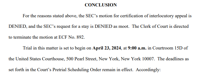 В кратком постановлении от 3 октября судья Торрес отклонила ходатайство SEC, заявив, что агентство не смогло выполнить свое бремя доказывания — другими словами, SEC не смогла доказать, что существовали контролирующие вопросы права в отношении существенных оснований для разногласий.