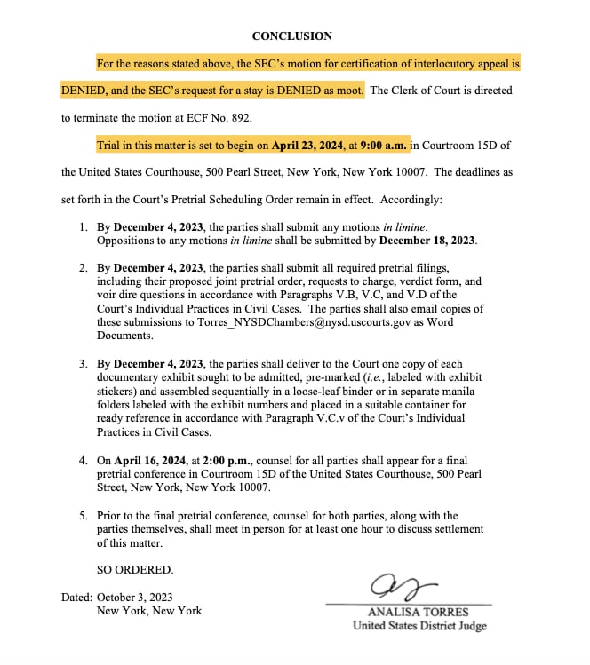 The SEC’s request to file an interlocutory appeal is DENIED. I’m not a lawyer but it seems the Court just told the SEC: You asked me to apply the “Howey” test, I did, and like it or not, you lost. https://t.co/0E4MS0iuRY pic.twitter.com/bkhCpum17n
