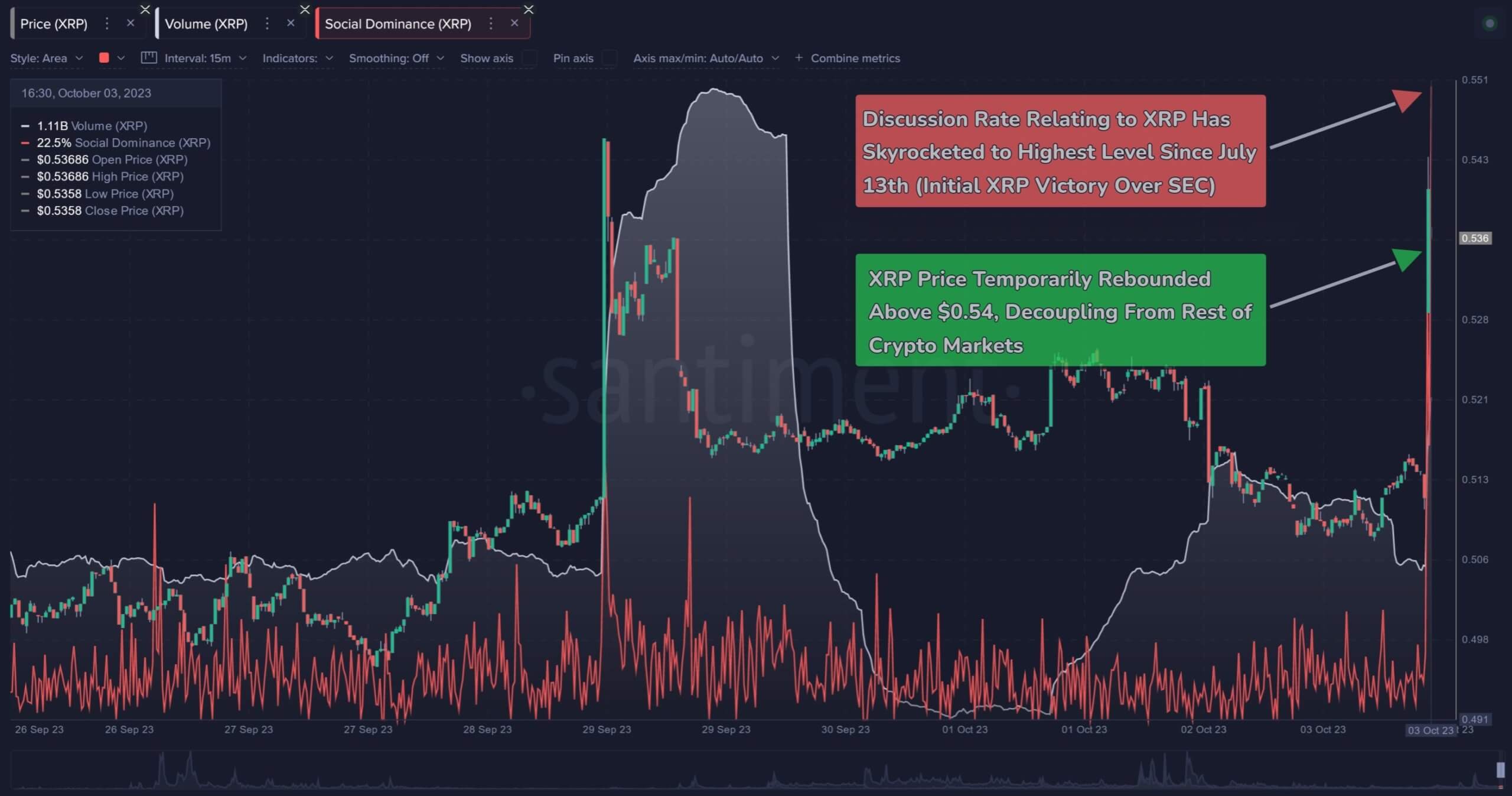 Как отмечают аналитики Santiment, число упоминаний XRP в социальных сетях в ответ на новое решение судьи прыгнуло до максимума с 13 июля 2023 года. Именно тогда суд признал сделки с XRP таковыми, которые не являются ценными бумагами. При этом курс XRP прыгнул выше 54 центов, что выделило криптовалюту на фоне остального проседающего и нестабильного рынка.