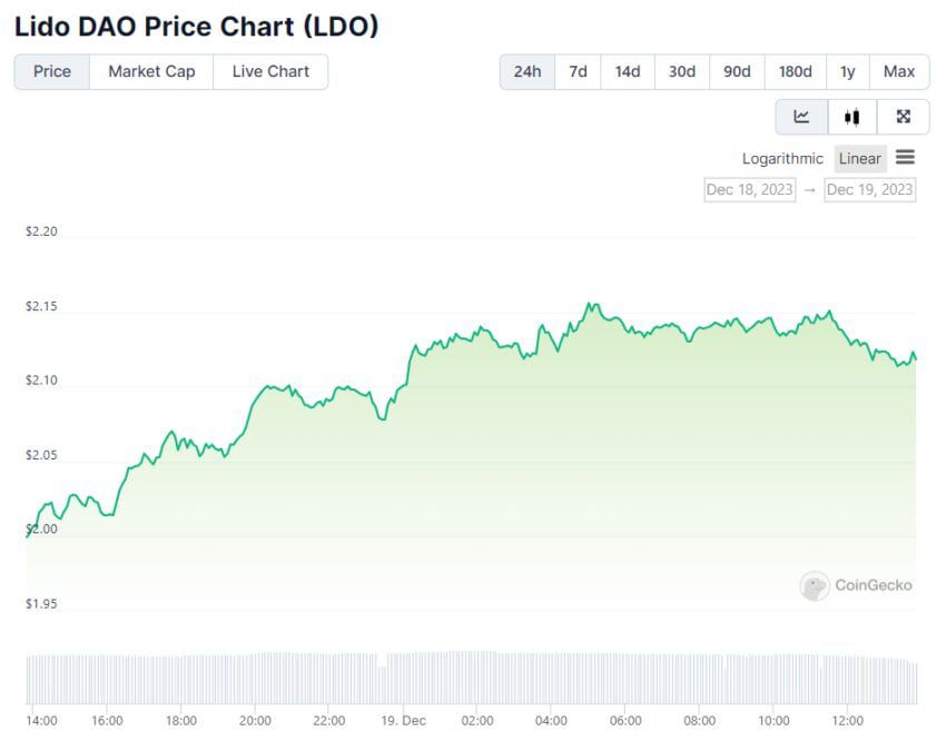 Токен управления Lido — LDO. Согласно CoinGecko, на момент написания актив торгуется по $2,12, за последние сутки увеличившись на 5,7%. При этом текущая стоимость монеты на 70% ниже абсолютного максимума (ATH), который был зафиксирован в августе 2021 года. Тогда курс LDO составлял $7,30.