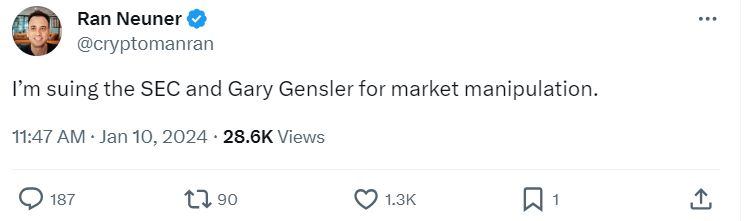 Криптоинвестор, соучредитель Onchain Capital Ран Ньюнер хочет засудить SEC и Гэри Генслера за манипулирование рынком. Информацией об этом он поделился с читателями своего микроблога.