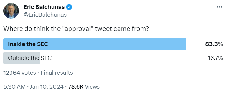Несмотря на то, что команда X подтвердила взлом аккаунта SEC, многие участники криптосообщества считают, что это не так. Результаты опроса аналитика Bloomberg Эрика Балчунаса показали, что 83% пользователей сети не верят в версию Комиссии. По их мнению, сообщение об одобрении спотовых биткоин-ETF написали сами комиссары. Причин, по которым они могли отказаться от своих слов, может быть несколько. Например, Комиссия могла установить неправильную дату публикации. Эту теорию, в том числе, поддержал бывший Помощник президента США по коммуникациям Энтони Скарамуччи.