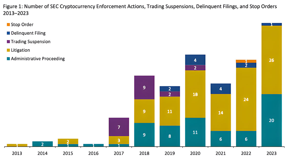 Следует отметить, что в 2023 году количество исков SEC против криптовалютных компаний увеличилось на 50% и достигло рекордных 46. В 61% случаев регулятор выдвинул обвинения в нарушении законов о ценных бумагах, а в 57% речь шла о мошенничестве.
