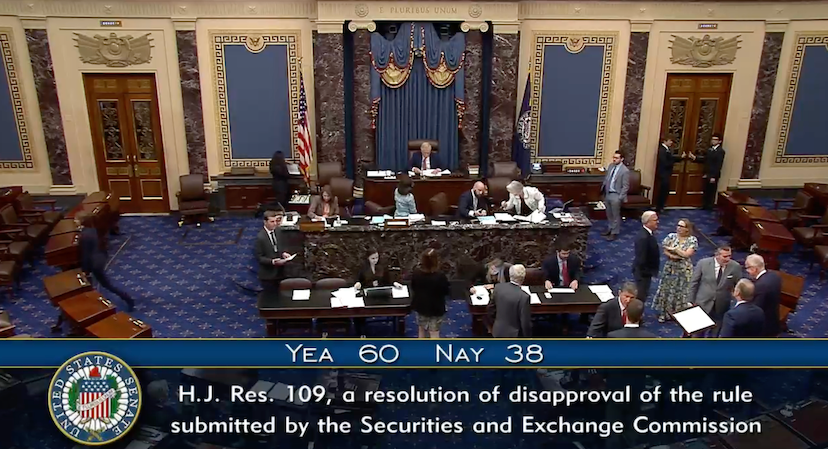 16 мая сенаторы США 60 голосами против 38 приняли резолюцию H.J.Res. 109, аннулирующую Бюллетень бухгалтерского учета персонала № 121 Комиссии по ценным бумагам и биржам (SEC). Правило комиссии требует, чтобы банки хранили цифровые активы клиентов на своих балансах, сохраняя за ними капитал — мера, которую многие законодатели и лидеры отрасли раскритиковали как удушающую инновации.