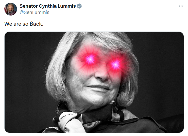 Синтия Ламмис, сенатор и сторонница биткоина (BTC), в ответ на итоги голосования опубликовала свою фотографию с лазерными глазами: