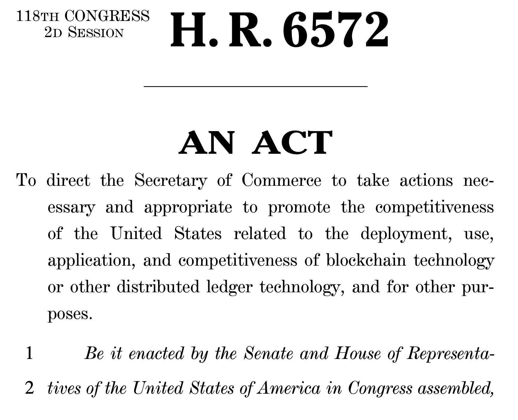 Двухпартийный законопроект предписывает министру торговли — в настоящее время Джине Раймондо — «принять необходимые и целесообразные действия для повышения конкурентоспособности Соединенных Штатов в технологии блокчейна или другой технологии распределенного реестра».