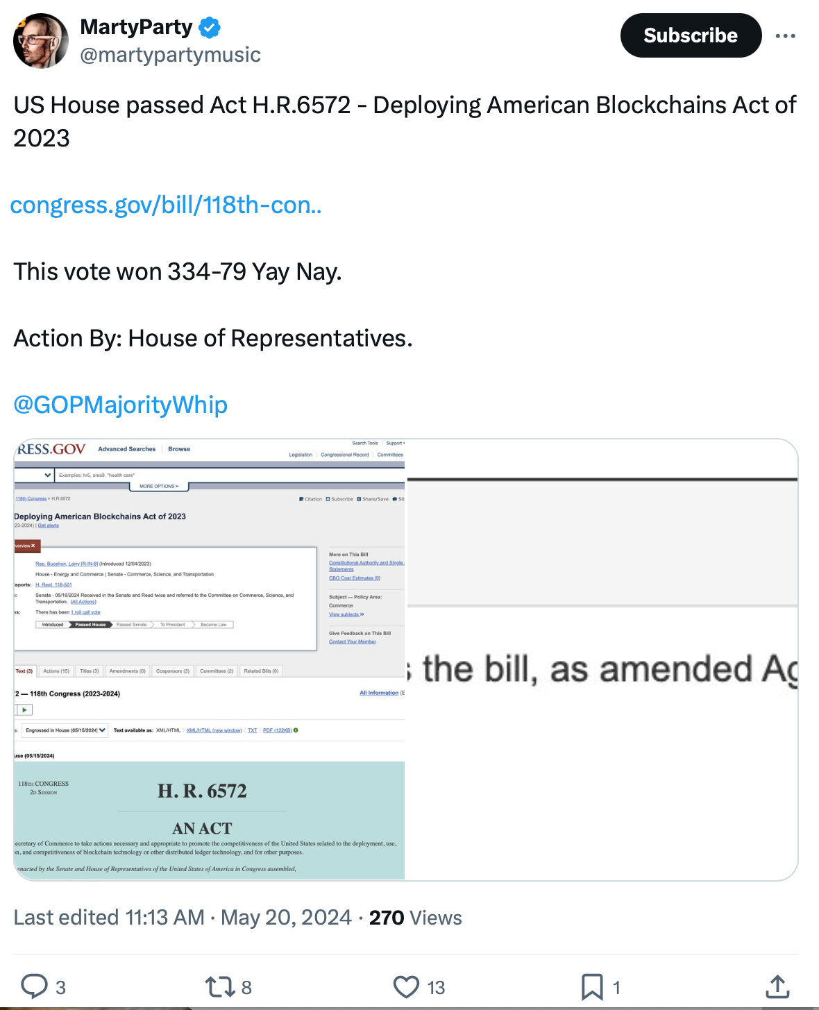 Палата представителей приняла законопроект 15 мая. В тот же день были приняты два закона, связанных с блокчейном — Закон о технологиях безопасности потребителей и Закон о содействии устойчивым цепочкам поставок. Все эти законопроекты теперь пойдут на рассмотрение в Сенат.