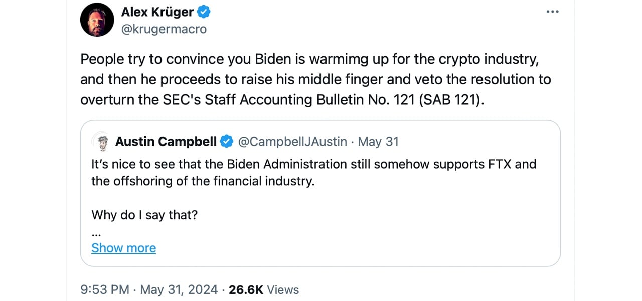 Решило ли вето Байдена на SAB 121 его политическую судьбу в 2024 году?