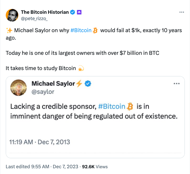До этого объявления Сэйлора можно было назвать скорее скептиком Биткоина. 7 декабря 2013 года он написал: