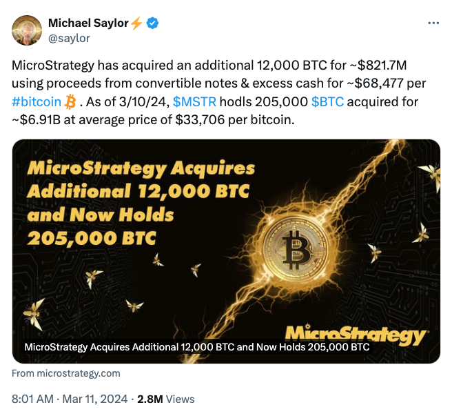 Несмотря на уход с поста генерального директора, Сэйлор продолжает поддерживать имидж MicroStrategy как компании, дружественной к биткоинам, регулярно объявляя о новых покупках биткоинов (BTC) на своем аккаунте X.