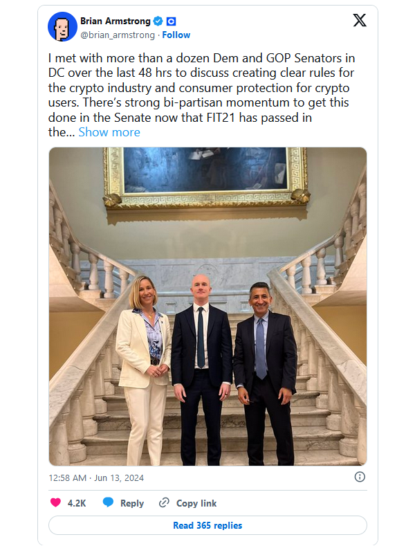 Что произошло? Глава ведущей американской централизованной криптобиржи (CEX) Coinbase Брайан Армстронг рассказал о переговорах с высокопоставленными чиновниками по вопросу регулирования сектора. Так, за последние два дня он встретился с несколькими сенаторами как от Демократической, так и Республиканской партий, и обсудил с ними создание четких правил для криптоиндустрии и защиты инвесторов.