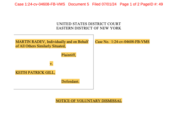Истец Мартин Радев отозвал иск 1 июня после подачи добровольного ходатайства об отклонении иска в суд Восточного округа Нью-Йорка.