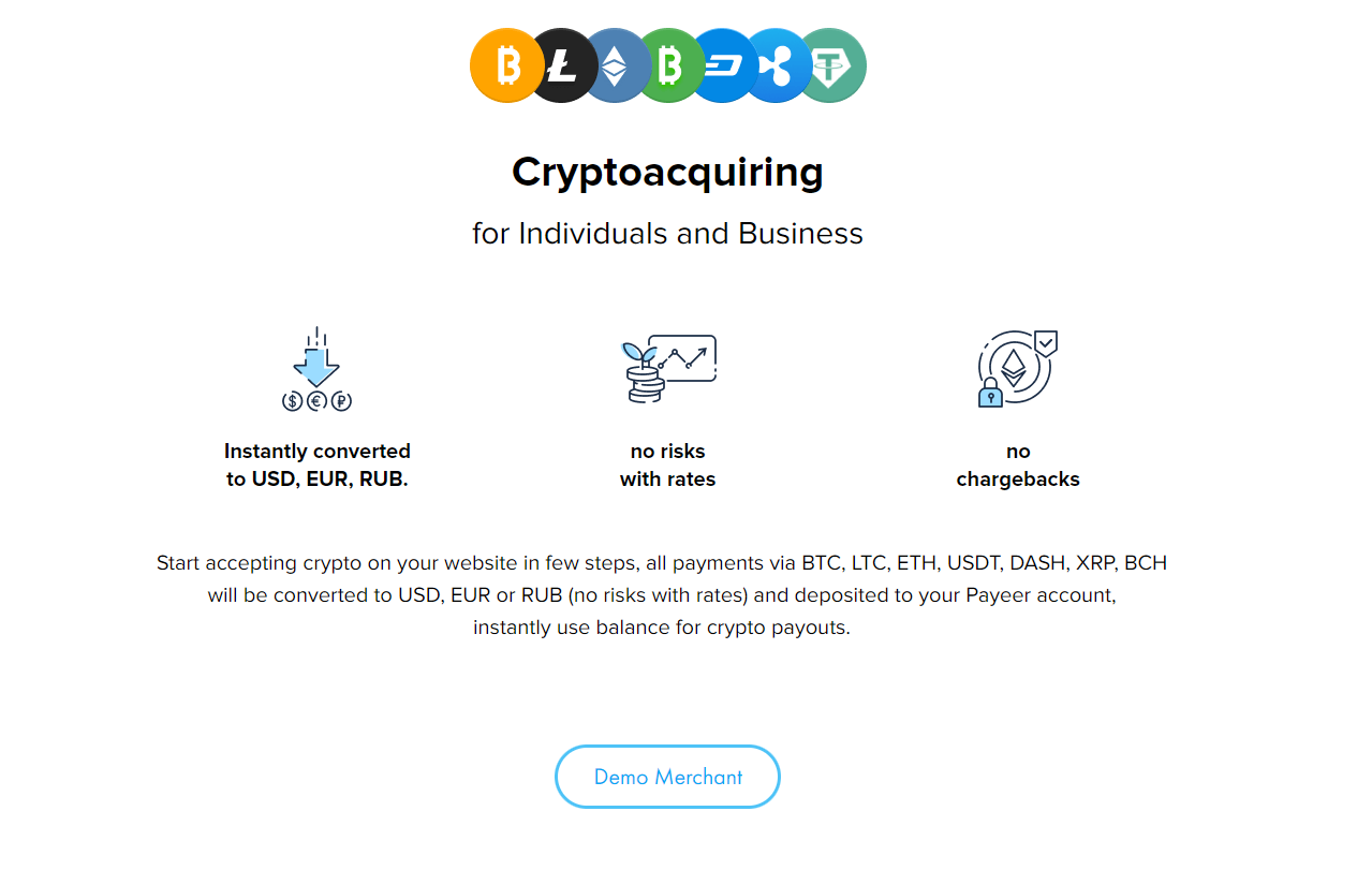 Payeer — это сервис обмена криптовалют и платежей в электронной коммерции. Согласно веб-сайту, он позволяет пользователям обменивать евро, доллары США и российские рубли, а также различные криптовалюты. Он также позволяет снимать средства с помощью дебетовых карт и предоставляет торговцам API для приема криптовалют в качестве оплаты за товары и услуги.