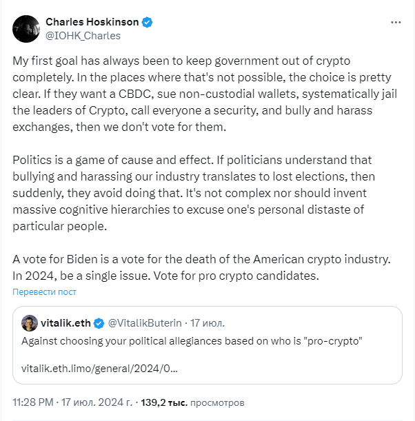 Завершая свой пост, Хоскинсон призвал людей «голосовать за кандидатов, выступающих за криптовалюту». Он добавил, что «голос за Байдена — это голос за смерть американской криптоиндустрии».